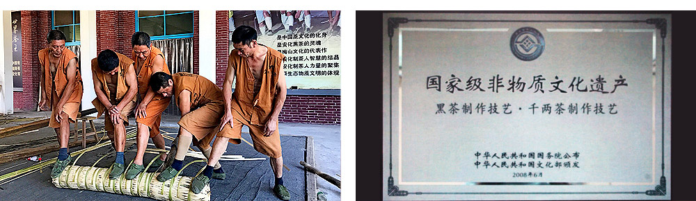 在雪峰山脈這片神奇的土地上,秀麗的風(fēng)光和適宜的氣候孕育出享譽(yù)世界的安化黑茶,其中較具代表的千兩茶堪稱安化黑茶“一絕”?!盎镉?jì)們咧,把杠抬啰,齊心壓咧,用力踩呦,呦嗨!”在這原生態(tài)的帶有濃郁茶文化氣息的踩茶號子中,粗獷的男性力量與黑茶原始野性完美融合,貫穿于神秘千兩茶的每一道古老手工工序中,又經(jīng)日曬夜露,吸天地之靈氣,納宇宙之精華于茶體,讓你猶如身臨遠(yuǎn)古秘境,領(lǐng)略千兩傳奇風(fēng)采。