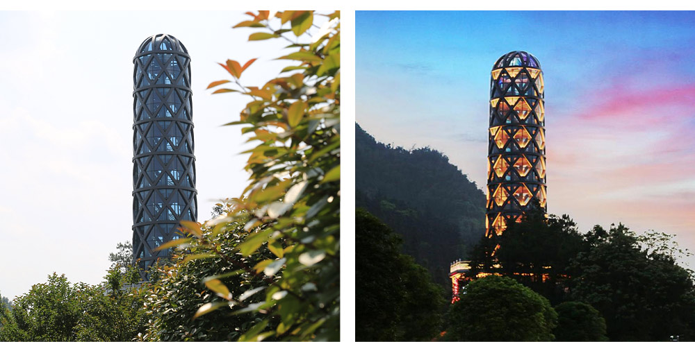 中國目前唯一的黑茶標(biāo)志性景觀建筑。建成于2016年,總造價(jià)約450萬元,占地面積3500平方米,總建筑面積180平方米。景觀塔位于安化縣百里畫廊風(fēng)光帶、白沙溪茶廠西側(cè)小山丘上,南抵省道S308線,北臨資江。塔高27.5米,共7層,由塔座和塔身兩部分組成。塔座呈八邊形,仿千兩茶底座設(shè)計(jì),為前廳和設(shè)備層;塔身呈園形,仿千兩茶花格篾簍外觀設(shè)計(jì),塔內(nèi)有螺旋式階梯而上,一至六層為游客觀光層,七層為茶室和接待室。景觀塔創(chuàng)作思路源于“世界茶王”千兩茶,景觀與觀景雙重功能結(jié)合,設(shè)計(jì)方案導(dǎo)入傳統(tǒng)塔式建筑的構(gòu)造特點(diǎn),傳統(tǒng)文化諸如壯風(fēng)水、鎮(zhèn)地脈、束水口、開文峰等意識形態(tài)為景觀塔鍍上一層神秘色彩。最有現(xiàn)實(shí)意義的是,該塔通體透亮,視野開闊,游客可信步登臨盤旋而上的扶梯逐層欣賞安化山形水色,領(lǐng)略白沙溪黑茶文化產(chǎn)業(yè)園區(qū)全景。每當(dāng)夜幕降臨,千兩茶王景觀塔放射出絢爛光芒,格外美麗。有詩云:玉柱臨風(fēng),茶王展世界;步步高升,塔中看天下。