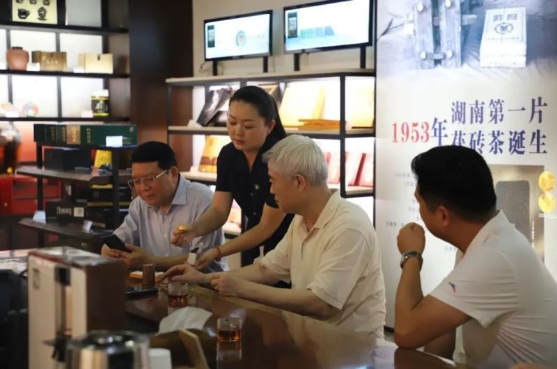 最后,考察組來到白沙溪黑茶體驗中心品飲白沙溪黑茶,并就黑茶如何做到認可度更大、競爭力更強、品牌更響,從品質提升等方面與劉新安進行了深入的交流與探討。劉新安從五方面闡述安化黑茶未來市場潛力巨大:安化黑茶是中國六大茶類中唯一被政府管控的茶類,具有獨特的健康屬性,是“富貴病”的克星,是21世紀人類健康之飲。且黑茶價格實在、實惠、好喝。近年,安化黑茶高質量發展,原料越來越好,品類越來越多,工藝水平大幅提升。安化黑茶從邊銷轉入內銷、外銷、邊銷并舉時代,品牌是靠品質決定的。張綱對此十分贊賞。