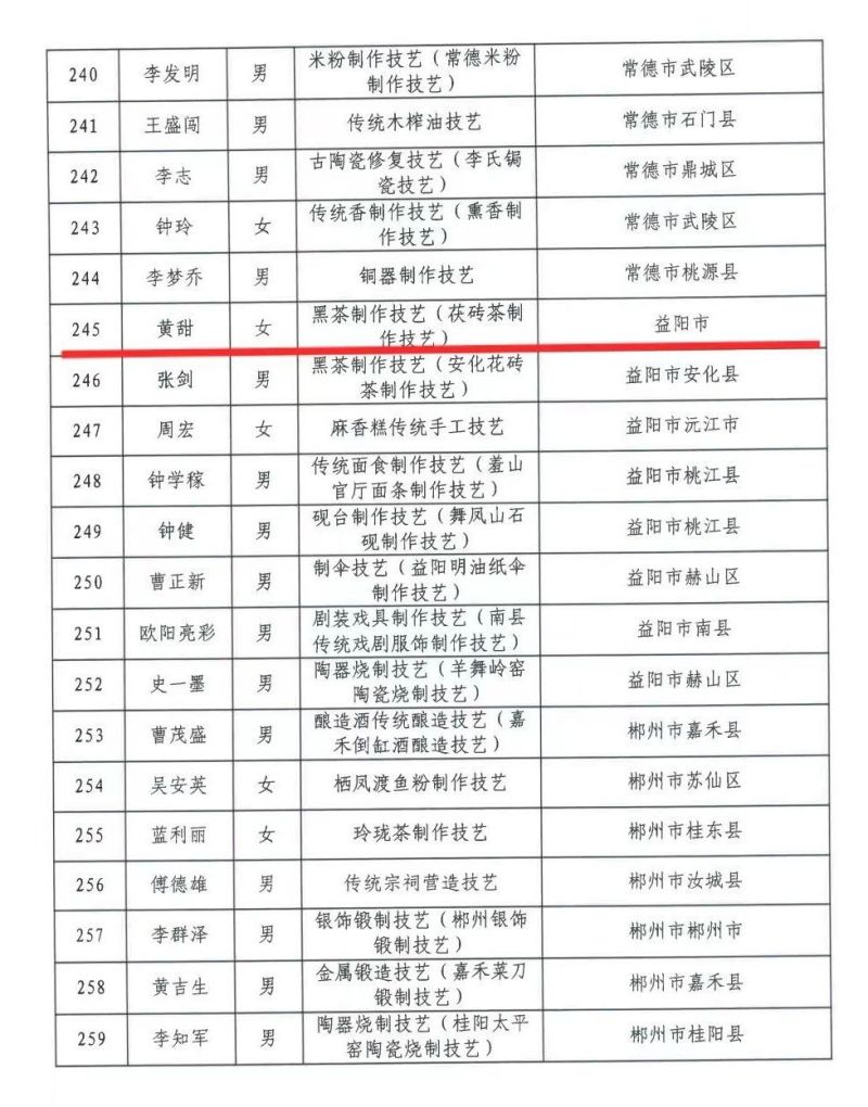 為深入學習貫徹習近平文化思想,加強非物質文化遺產傳承人隊伍建設,有效保護和傳承省級非物質文化遺產代表性項目,根據《中華人民共和國非物質文化遺產法》《湖南省實施<中華人民共和國非物質文化遺產法>辦法》,參照《國家級非物質文化遺產代表性傳承人認定與管理辦法》要求,經各地申報、專家評審、現場答辯、評審委員會審議、社會公示等程序,省文化和旅游廳確定了第五批省級非物質文化遺產項目代表性傳承人名單(326人),其中集團益陽茶廠(以下簡稱益陽茶廠)黃甜榮獲第五批省級非物質文化遺產項目黑茶制作技藝(茯磚茶制作技藝)傳承人稱號。