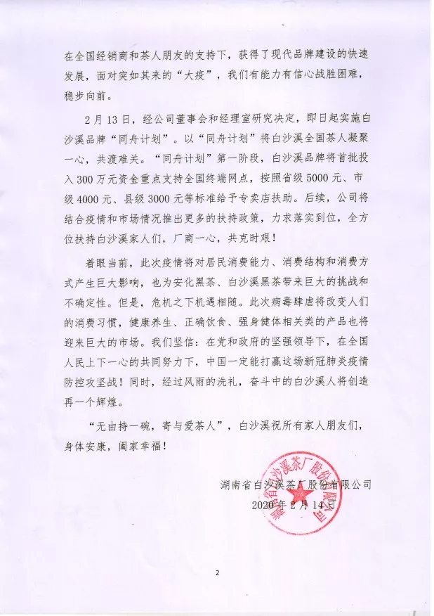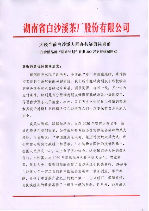 白沙溪品牌“同舟計劃”首批300萬支持終端網點