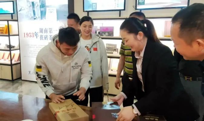 奧運冠軍諶利軍在講解員的帶領下參觀了白沙溪黑茶文化博物館、了解安化黑茶名片白沙溪品牌故事文化。接著參觀了千兩茶晾曬場、沿江風光帶、白沙溪文化長廊、白沙溪古茶園、白沙溪茶碼頭。在千兩茶晾曬場,興致地為白沙溪千兩茶簽名,隨后在黑茶體驗中心進行了簡短的座談交流。
