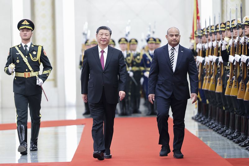 3月25日下午,國家主席習近平在北京人民大會堂同來華進行國事訪問的瑙魯總統阿迪昂舉行會談。這是會談前,習近平在人民大會堂北大廳為阿迪昂舉行歡迎儀式。新華社記者 申宏 攝
