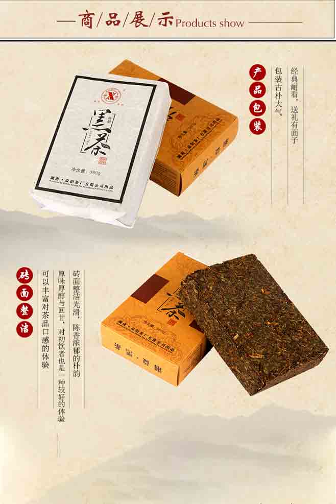 益陽茶廠是全國茯磚茶生產廠家和茯磚茶原料儲備承儲企業,創建于1953年,“湘益”素有“古絲綢之路上的神秘之茶”、“西北少數民族的生命之茶”的美譽,其“茯磚茶手筑工藝”已被列入國家級非物質文化遺產保護名錄。 ??“湘益”茯茶均采用優質黑毛茶為原料,經篩分投入拼配篩制—汽蒸渥堆—壓制定型—發花—干燥出烘—包裝入庫等工序精制而成,茶葉金花普茂,湯色紅濃,滋味醇厚,具有明顯的調節新陳代謝、降脂降糖功效。