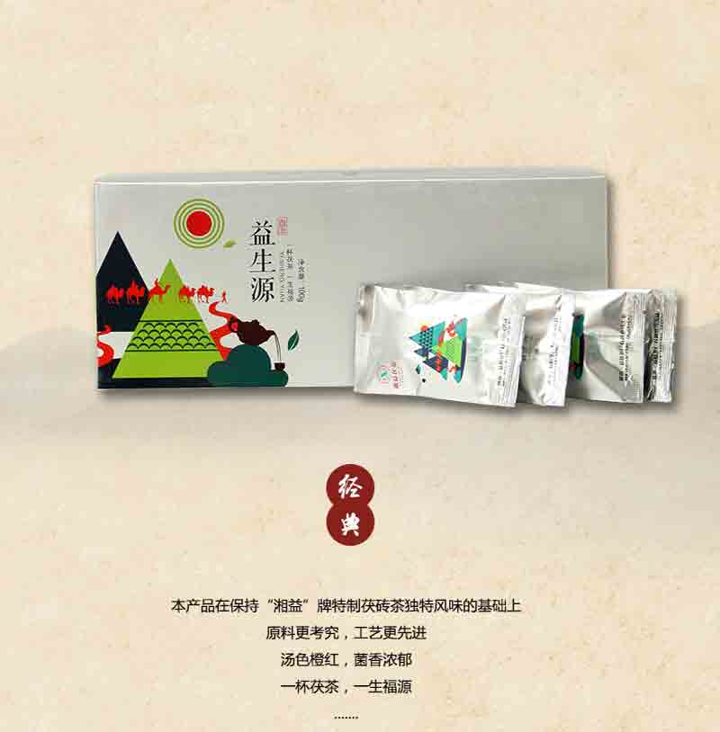 益陽茶廠是全國茯磚茶生產廠家和茯磚茶原料儲備承儲企業,創建于1953年,“湘益”素有“古絲綢之路上的神秘之茶”、“西北少數民族的生命之茶”的美譽,其“茯磚茶手筑工藝”已被列入國家級非物質文化遺產保護名錄。 ??“湘益”茯茶均采用優質黑毛茶為原料,經篩分投入拼配篩制—汽蒸渥堆—壓制定型—發花—干燥出烘—包裝入庫等工序精制而成,茶葉金花普茂,湯色紅濃,滋味醇厚,具有明顯的調節新陳代謝、降脂降糖功效。